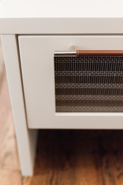 the drawer fronts are a metal mesh, and the long leather wrapped hardware is a nice textural addition.