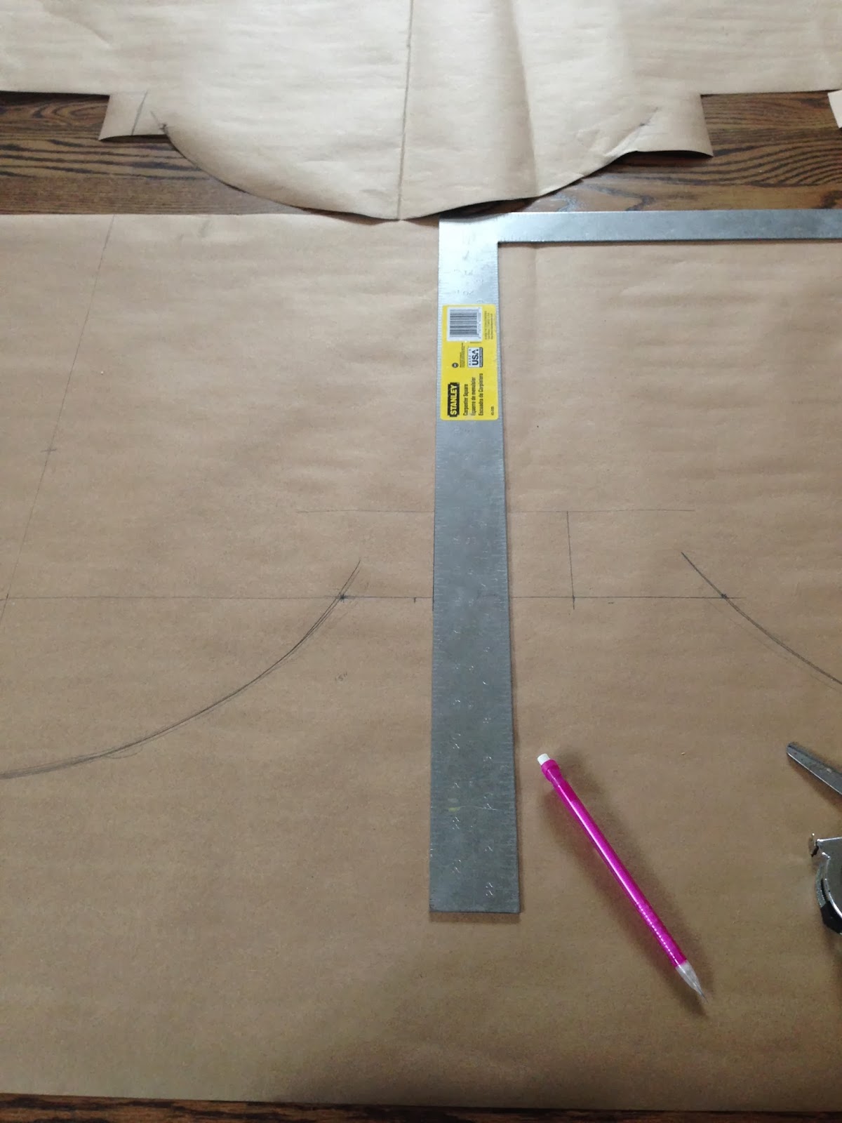 using the factory edge of the paper as a guide, i used a square to draw lines down and across to figure out where my major intersections were, and then drew in all of the straight lines. i used the pen and string to get my curves nice and neat. i only did this for one half of the template.